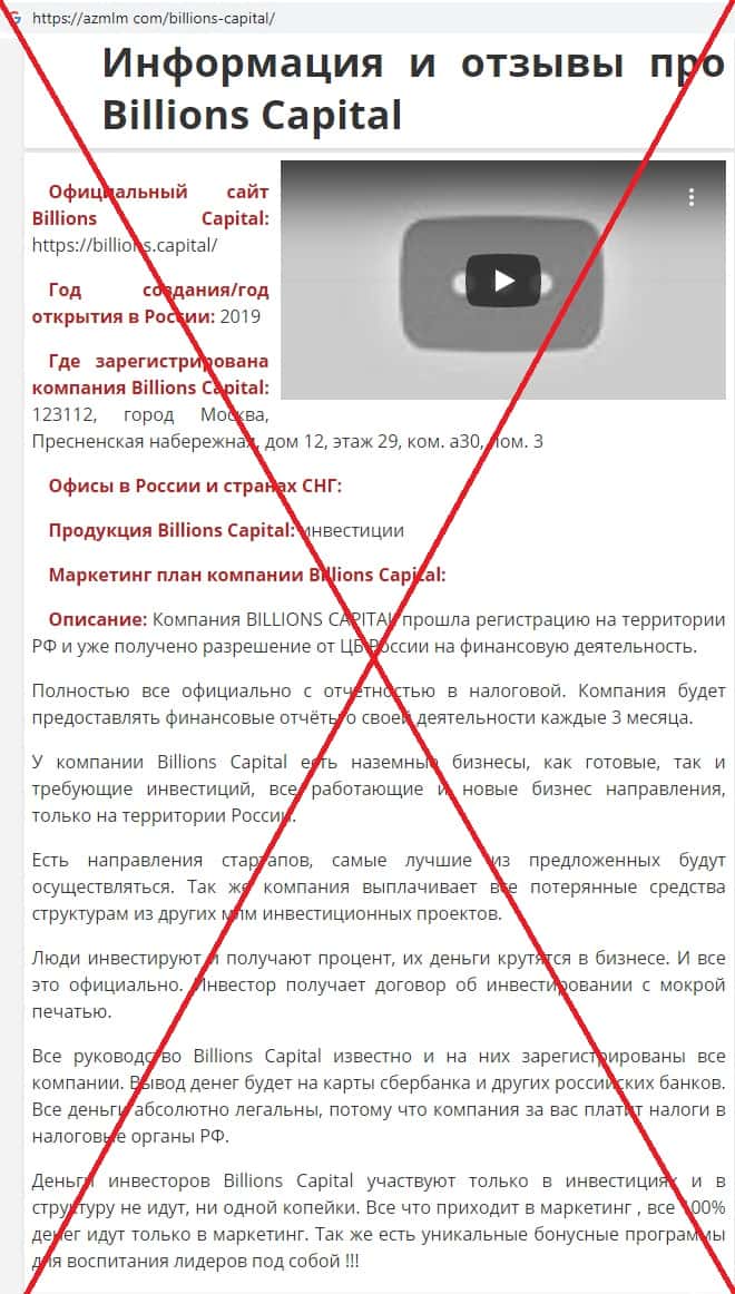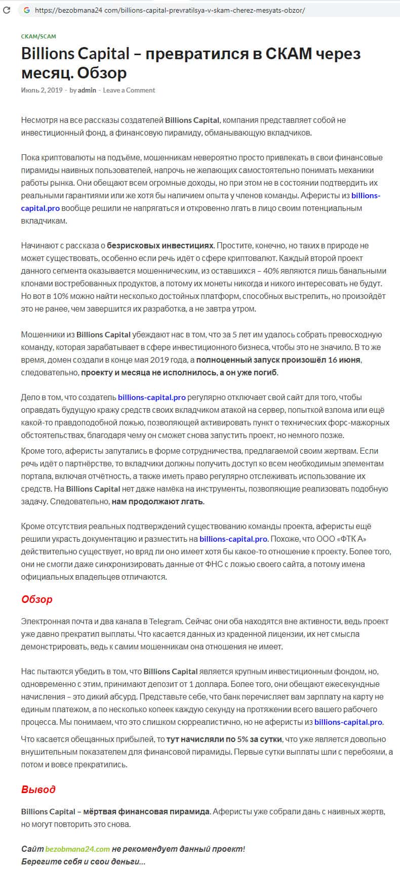 На сайте bezobmana24 com была найдена статья о скам-организации Биллионс Капитал. Несмотря на все рассказы создателей Биллионс Капитал, компания представляет собой не инвестиционный фонд, а финансовую пирамиду, обманывающую вкладчиков.