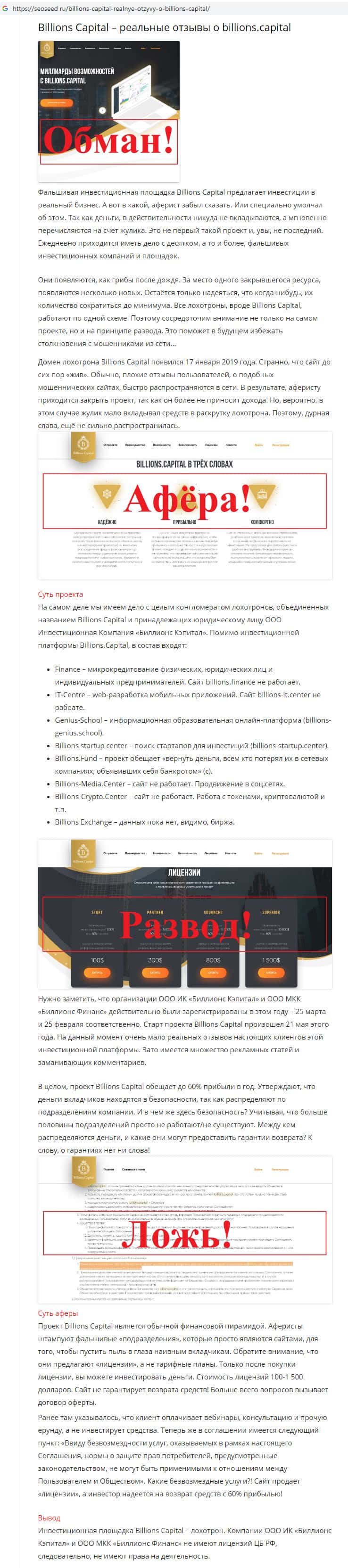 - Статья-отзыв о скам-компании Billions Capital найдена на сайте seoseed ru