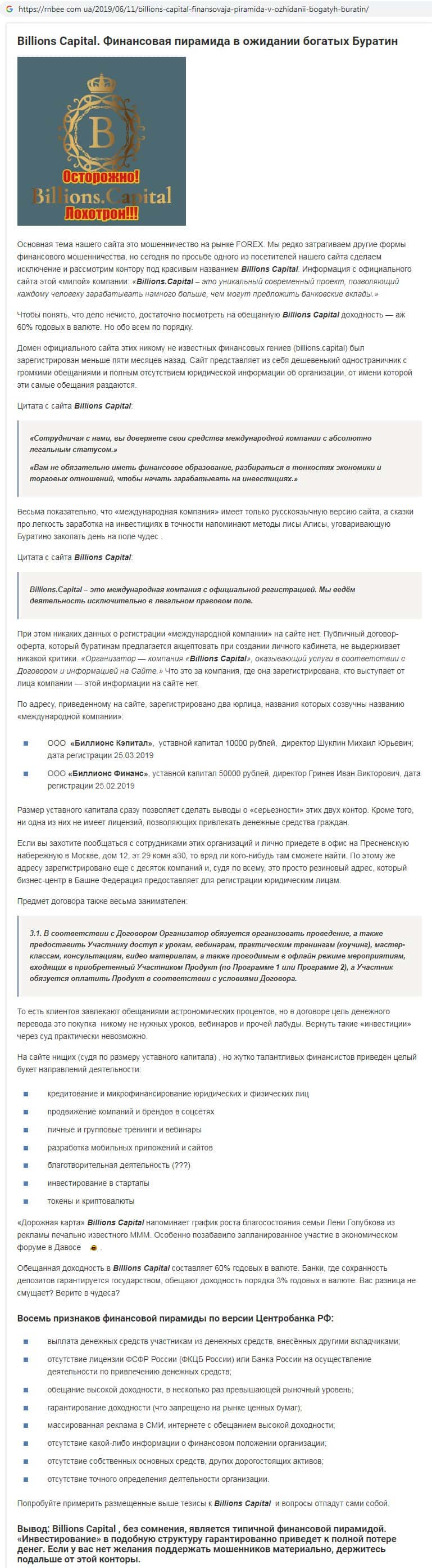 - Статья о жульнической организации Billions Capital найдена на веб-портале rnbee com ua