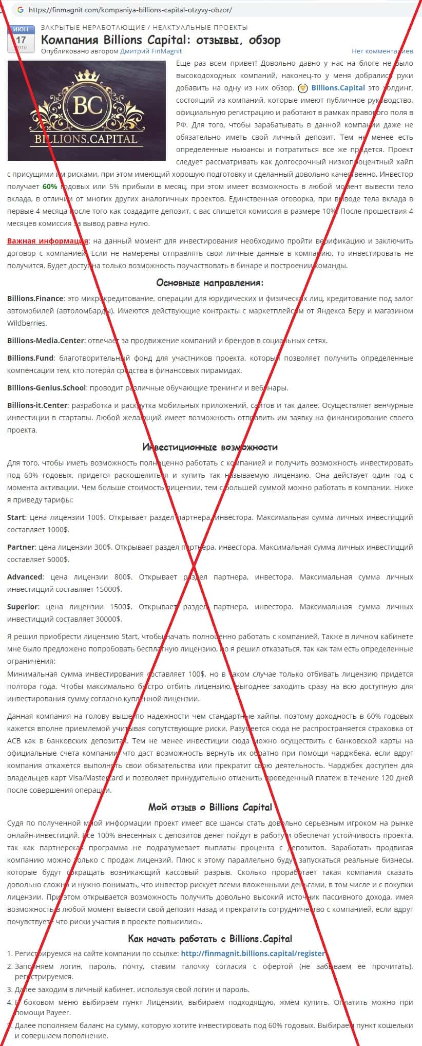 На сайте finmagnit com продемонстрировано как инвест-лохотрон Биллионс Капитал сам себя рекламирует. Данный отзыв написан в формате статьи о том, как правильно пользоваться сайтом компании Биллионс Капитал. Будто кто-то написал статью о том, как правильно начать торговать на официальном сайте инвест-лохотрона Биллионс Капитал, который обещает якобы 60% годовых.