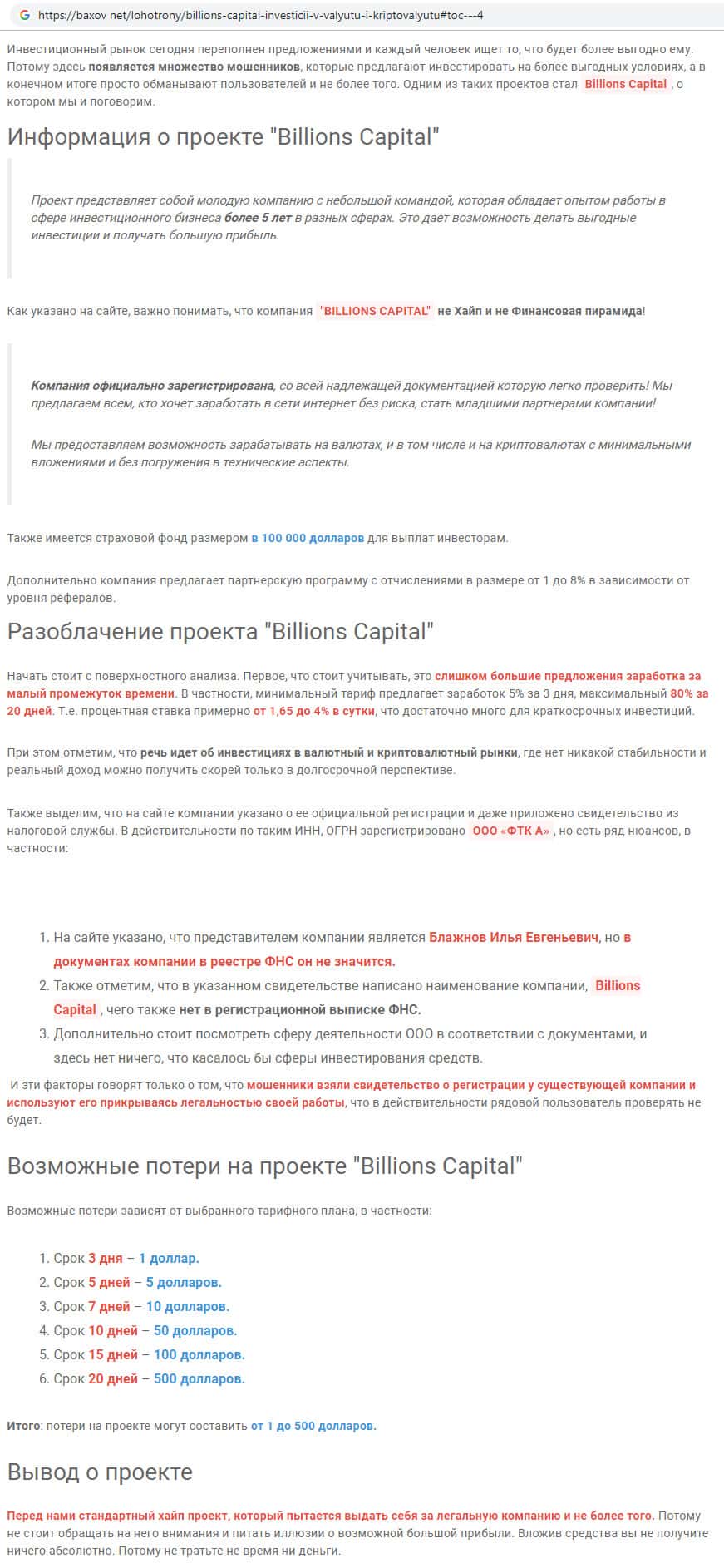 - Еще одна статья-отзыв о конторе Billions Capital в глобальной сети baxov net