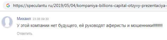 Данный комментарий о скам-компании Биллионс Капитал был найден на веб-сайте speculantu ru в ответ на вышеупомянутую статью. Некий Михаил, автор данного отзыва целиком и полностью прав в том, что компания Биллионс Капитал аферисты и мошенники.