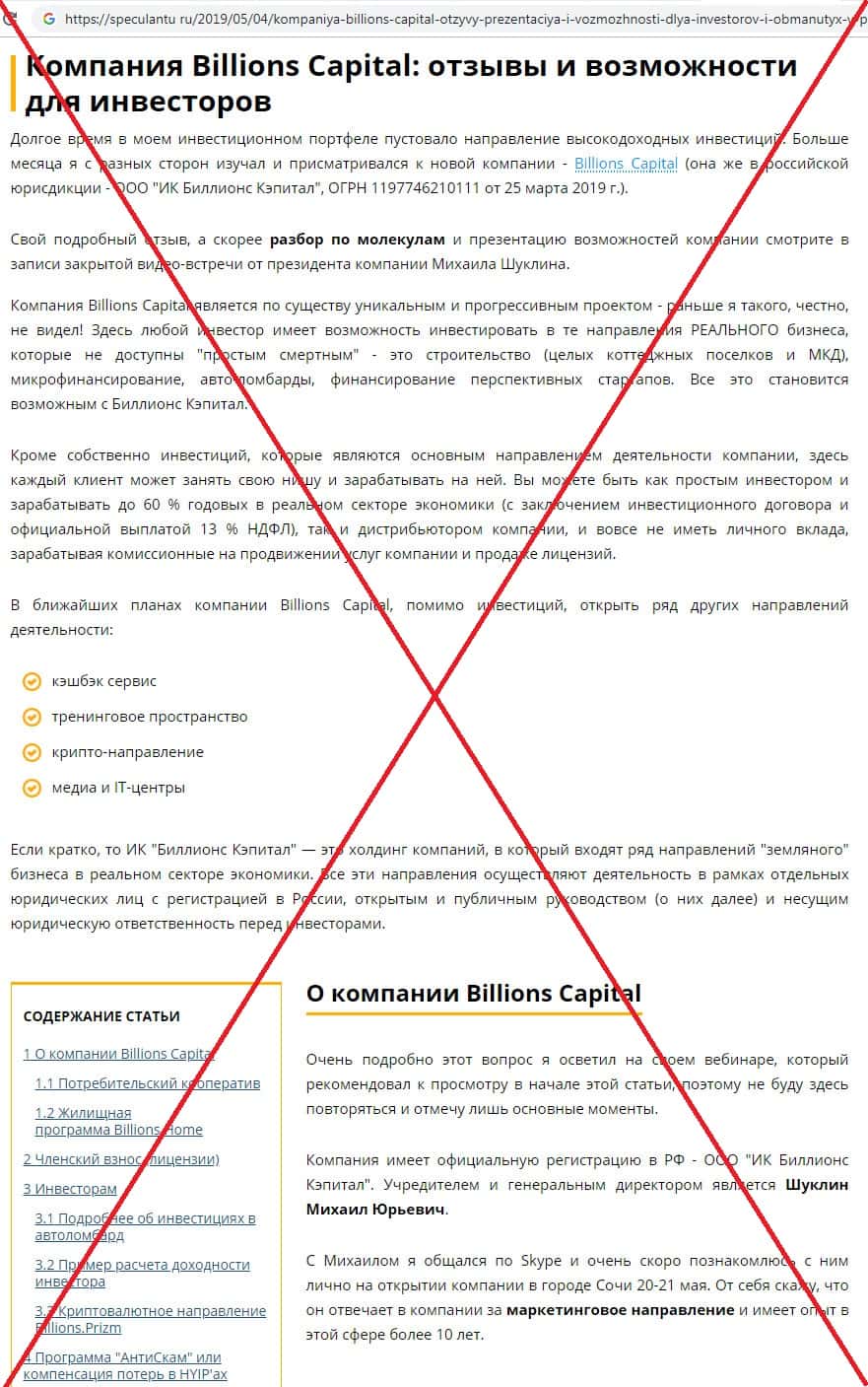 - Скам-статья о компании Billions Capital на информационном сайте speculantu ru