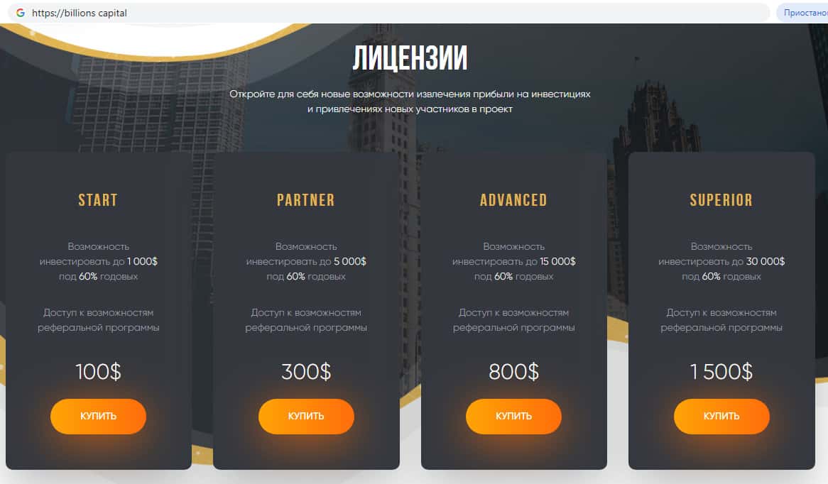 Инвест-лохотронщики из Биллионс Капитал предлагают клиенту приобрести лицензию за определенную сумму денег, что якобы обещанная прибыль аж 60%. Но написанному на сайте мошенников Биллионс Капитал верить не следует, потому как не бывает прибыли из неоткуда.