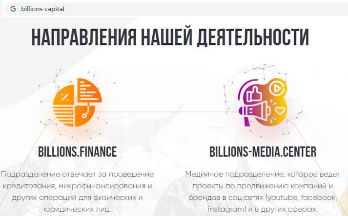 Направления деятельности скам-компании Биллионс Капитал