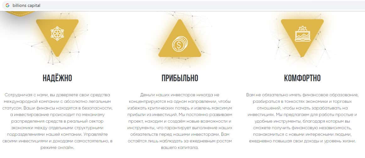 О своих преимуществах представители скам-конторы Биллионс Капитал готовы написать все что угодно лишь бы Вы положили свои денежки на их счет. Мошенники из Биллионс Капитал гарантируют сохранность Ваших средств, безопасность и конечно же удобство пользования их официальным сайтом.