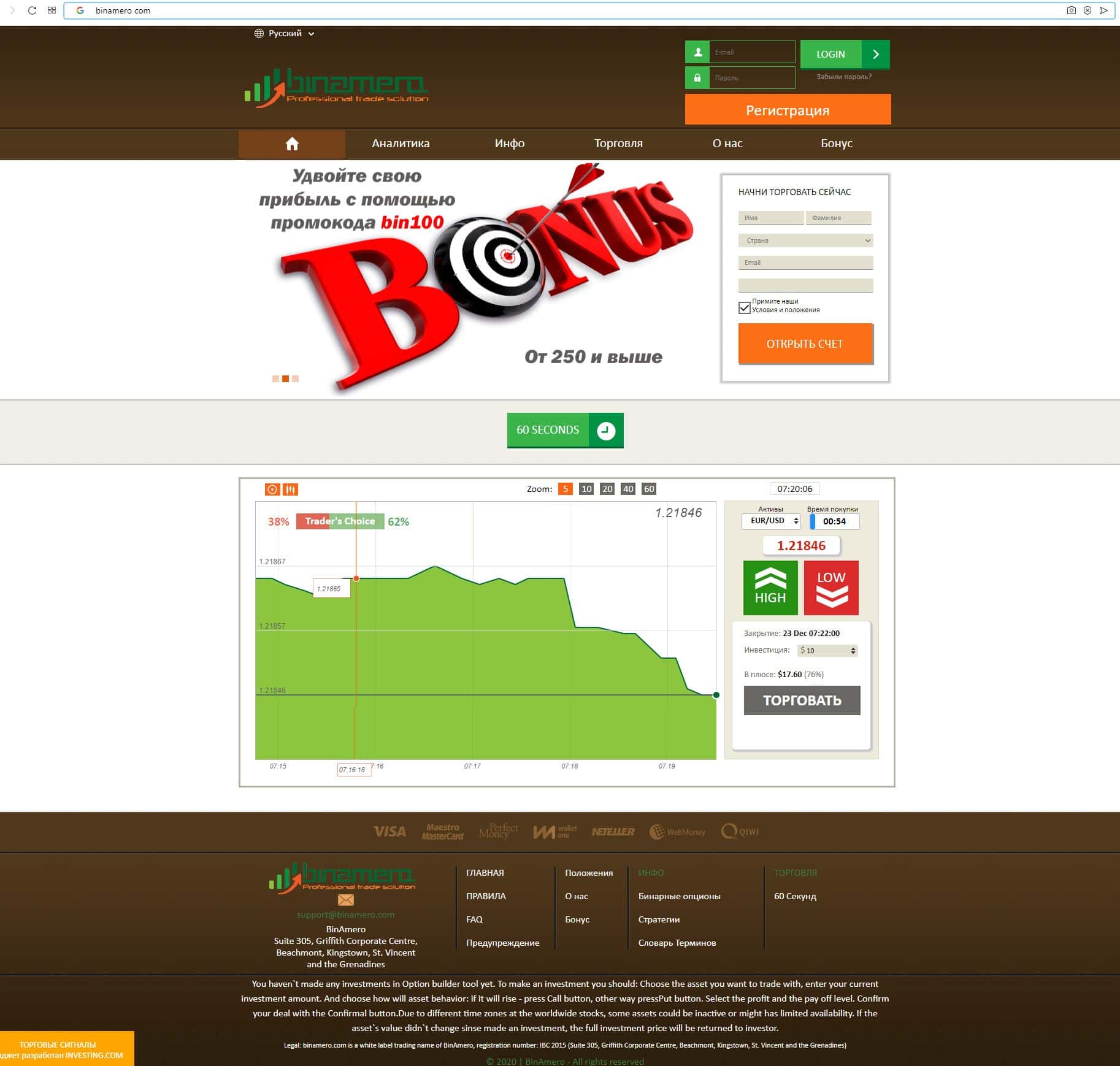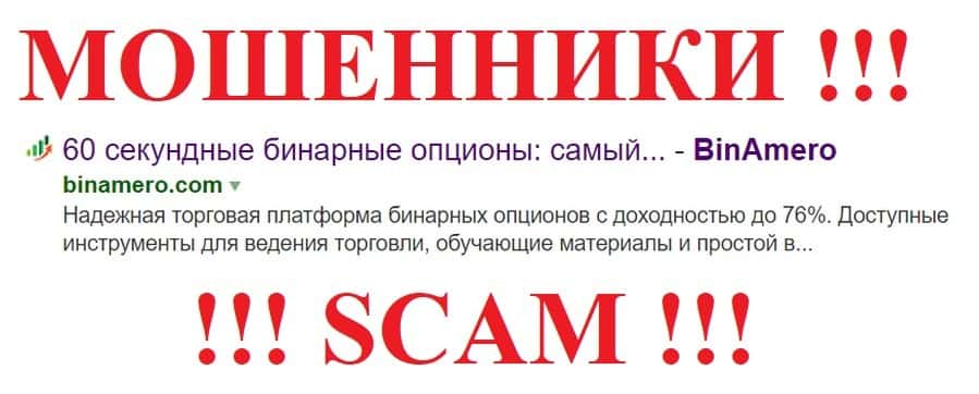 Bin Amero - очередная псевдо-брокерская организация, которая обманывает людей на деньги, аферисты предлагают торговать на рынке бинарных опционов, при этом рассказывая сказки о якобы самых низких комиссиях, скам-брокер обзавелся негативной репутацией в сети-интернет, сайт шулеров является точной копией сайта лохотронов LibraOption и PlatinumBIN, также известно, что жулики работают в одной связке с мошенниками Investing Com, у конторы нет лицензии, о юридических лицах и руководстве компании также ничего не известно. Не связывайтесь с обманщиками Бин Амеро !!!