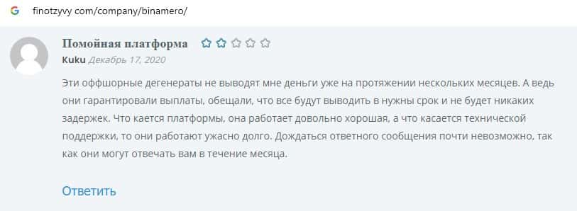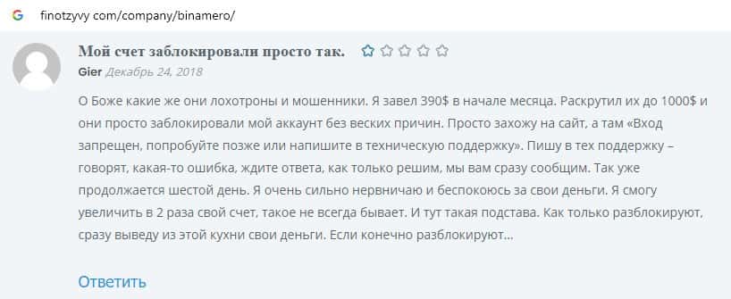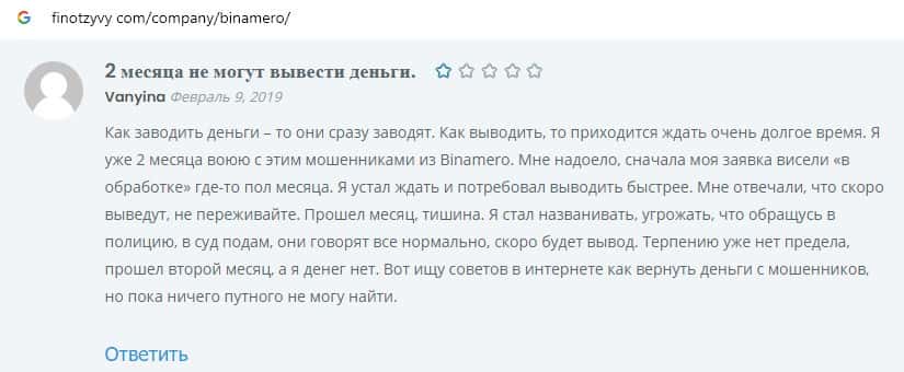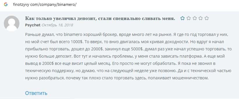 Далее предоставлен очередной пользовательский отзыв о том, что шулера Bin Amero не дают вывести свои деньги, оставляя все средства себе в карман.