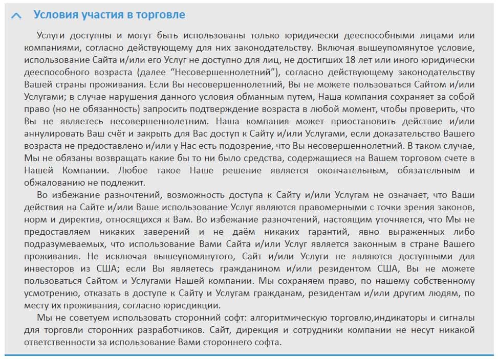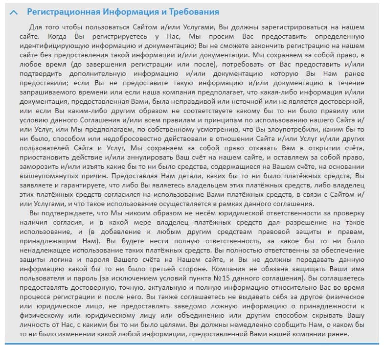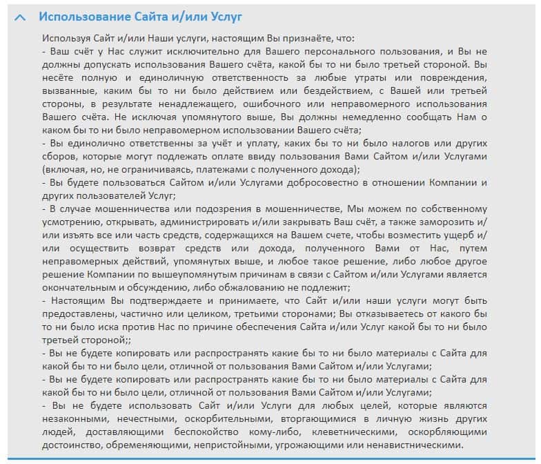 Здесь аферисты Бин Амеро разместили информацию о том, что запрещается пользователям делать на их дырявом сайте.
