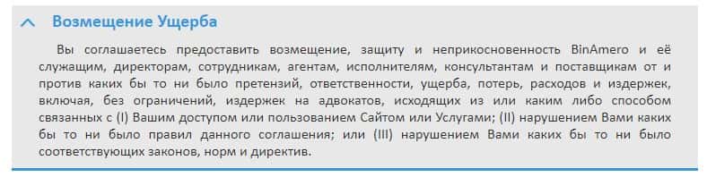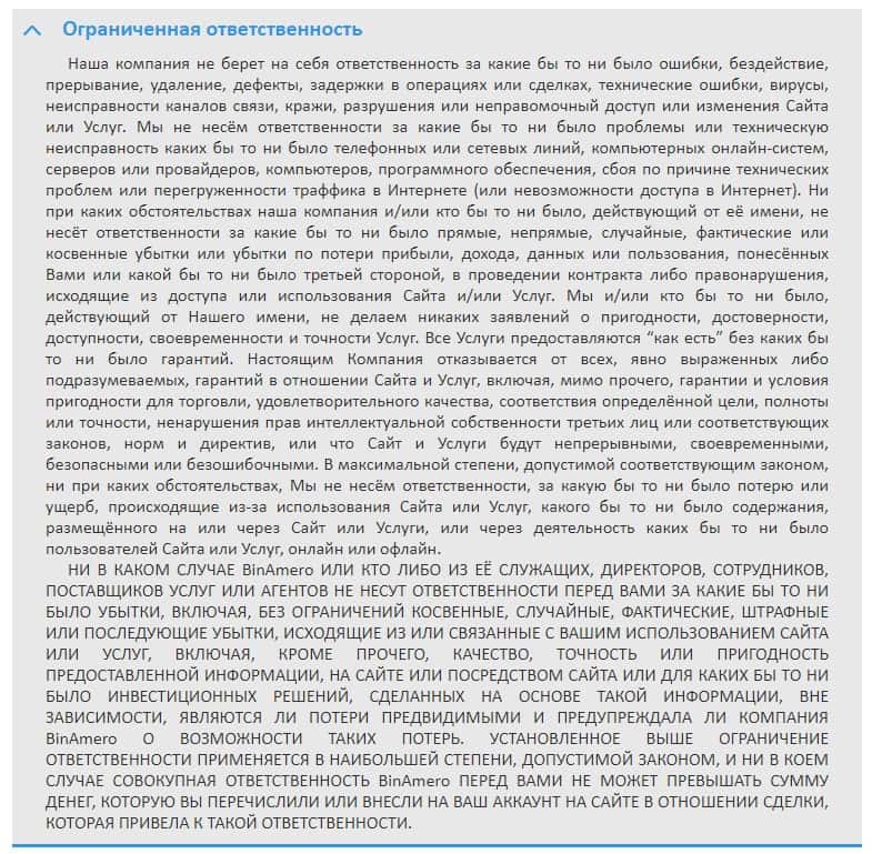 Согласно тому, что аферисты пишут в соглашении, компания Бин Амеро не несет никакой ответственности за не полученную прибыль клиентом, а также за возможные убытки.