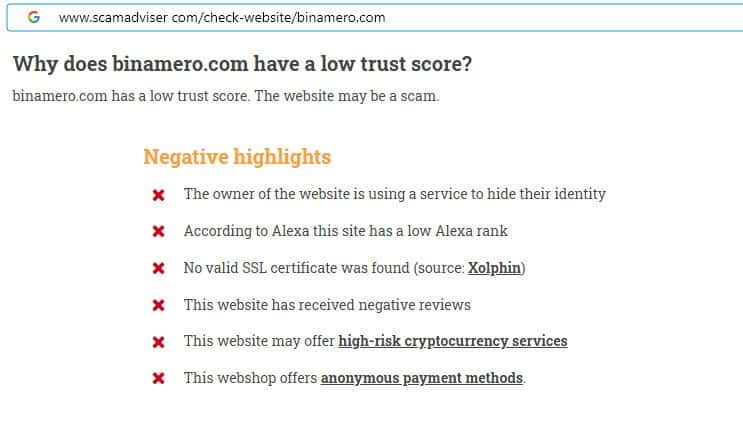- Уровень доверия к сайту жульнической конторы Bin Amero низкий