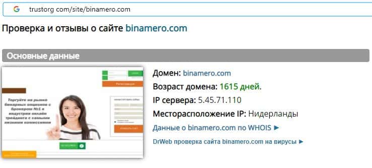 Проверка интернет-сервиса аферистов Bin Amero на trustorg com показала, что возраст домена к моменту написания статьи составляет 1615 дней, вероятнее всего домен купленный.