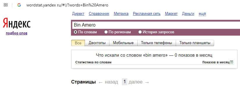 О количестве брендовых запросов англоязычного названия компании "Bin Amero" на wordstat yandex ru нет информации.
