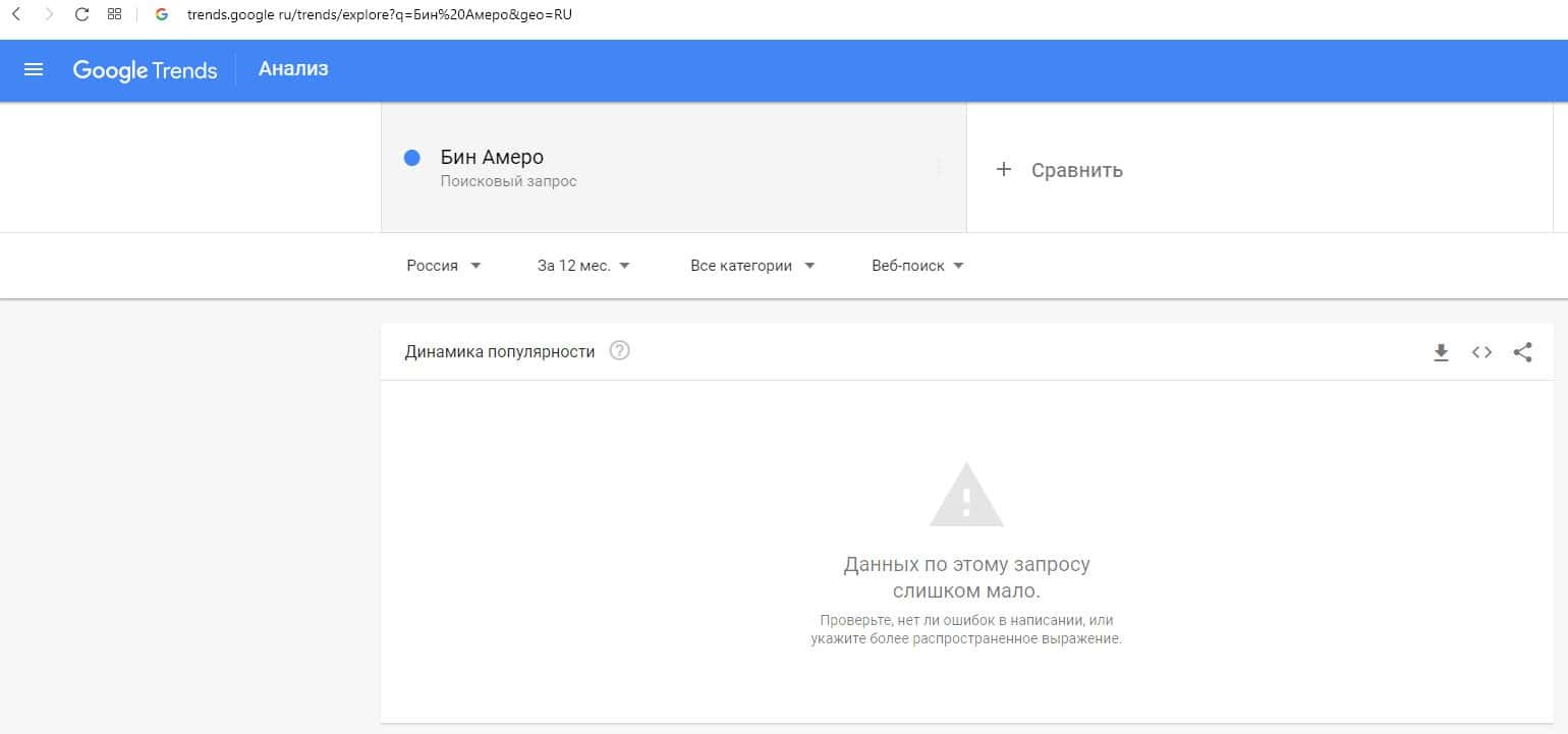 По количеству брендовых запросов название домена компании "binamero.com" на Гугл Трендс данные отсутствуют.