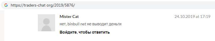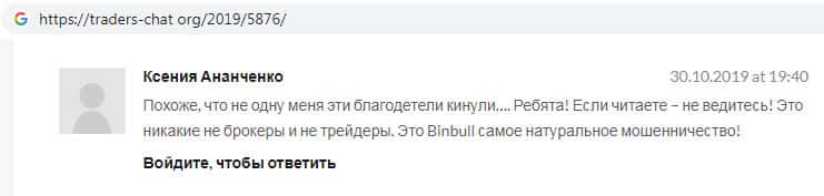В глобальной сети интернет имеется множество людей, которые готовы поверить в обман чистой воды со стороны любой жульнической организации, веря обещаниям подобных контор вроде Бин Булл. Подтверждением этому является найденный нами отзыв на сайте трейдс-чат орг, автором которого является будущая жертва мошенничества BinBull.