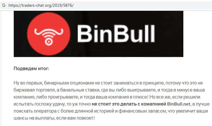 На сайте трейдс-чат орг был отыскан комментарий по поводу жульничества Бин Булл, которые кидали многих людей на немалые суммы денег, рассчитывая на то, что они верят только положительным отзывам. Мошенники BinBull специально публикуют фейковые отзывы для привлечения клиентов в свою шарагу.