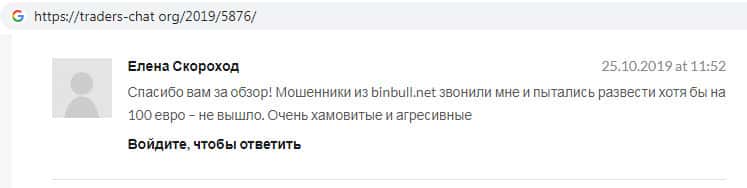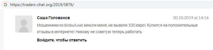 На сайте traders-chat org был обнаружен отзыв о мошенниках BinBull, автором которого является человек, которого кинули на 100 евро. Это произошло, потому что пользователь поверил обещаниям компании Бин Булл, которые могут пообещать все что угодно лишь бы обманным путем украсть деньги клиента.