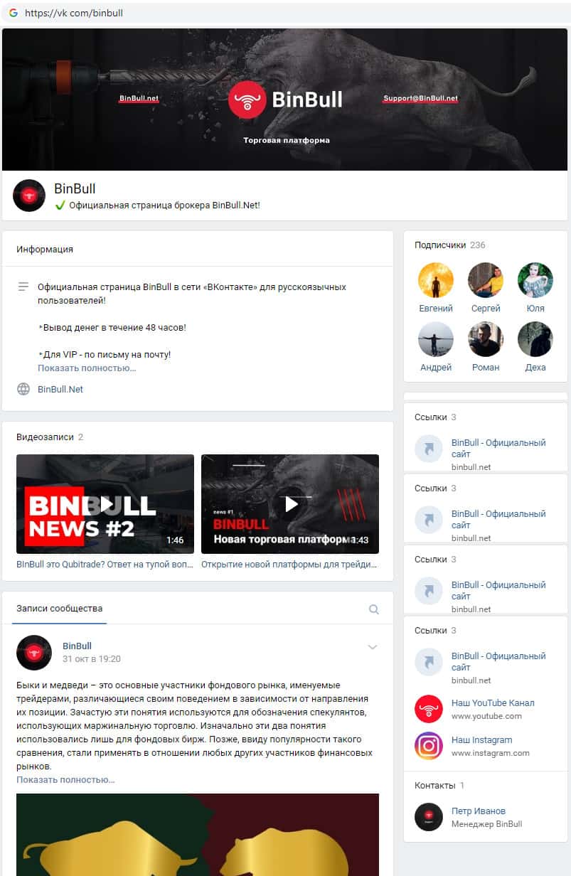 - Жулики BinBull зарегистрировались в социальной сети Vk com