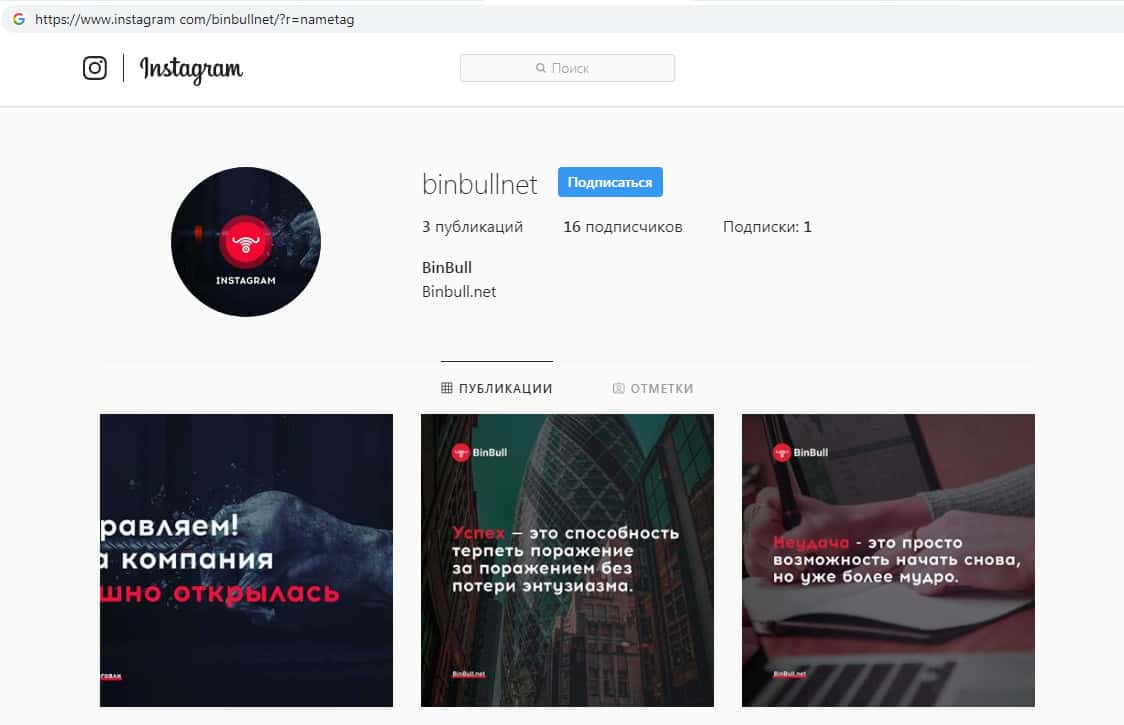 Так же скам-организация BinBull для привлечения как можно большего количества людей решила создать страницу в социальной сети instagram com, где мошенники выкладывают о себе очень мало информации, в основном это цитаты каких-то известных личностей, выдавая данные цитаты за свои суждения об успехе и удаче.