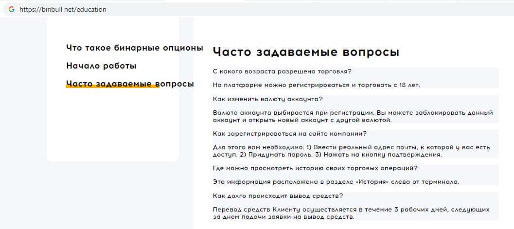 - Часто задаваемые вопросы на сайте мошеннической организации BinBull