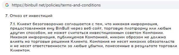 В условиях пользования сайтом аферистов Бин Булл замечена информация, которая противоречит той, что указанна на официальном сайте аферистов. Оказывается компания BinBull не имеет права мотивировать своих клиентов торговать на их сайте. Предлагаемая информация на данном сайте не должна влиять на торговые решения клиента.