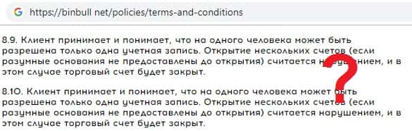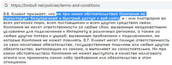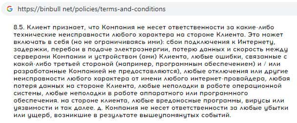 Мошенническая организация BinBull не несет ответственность за сбои в сети, а так же какие-либо технические неисправности. Аферисты Бин Булл во время перевода денежных средств списывают денежные средства с его торгового счета и обвиняют в этом некие сбои в сети интернет.