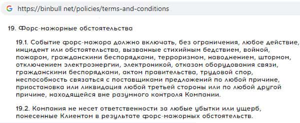 Компания BinBull не несет никакой ответственности за торговлю на данном сайте, перекладывая всю ответственность на возможные сбои в системе, проблемы с передачей данных, а так же на операционную систему и так далее.