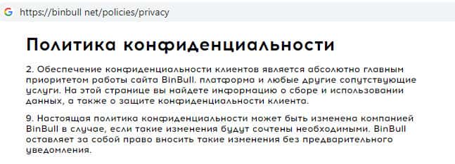 На официальном сайте мошенников BinBull была обнаружена информация о политике конфиденциальности и сохранности личной информации клиента. Жулики Бин Булл указывают о том, что данная скам-контора не несет ответственность за утерю личной информации клиента. Мы убеждены о том, что здесь о сохранности данных клиента и речи идти не может.
