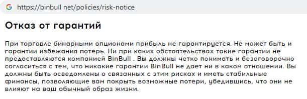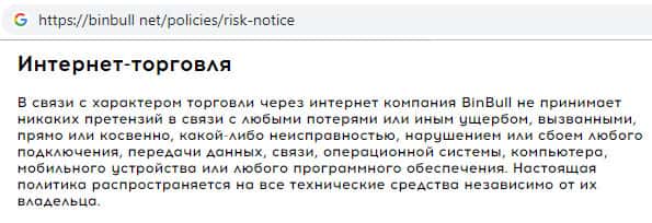 В уведомлении о рисках скам-организация BinBull указывает о том, что данная компания не несет никакой ответственности за деньги утраченные клиентом на их мошенническом сайте. В данном случае шулера Бин Булл ссылаются на ошибочный выбор торговой стратегии клиента.
