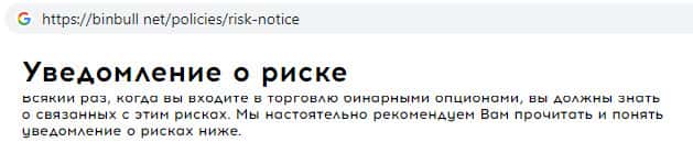 Информация о всевозможных рисках на сайте скам-организации BinBull