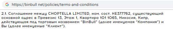 Жульническая организация BinBull имеет оффшорное место регистрации, а именно зарегистрирована на Кипре, что является показателем того, что компания не подходит для граждан РФ. В случае утраты Вами денежных средств Вы ничего не докажете и не сможете вернуть свои денежные средства обратно !!!