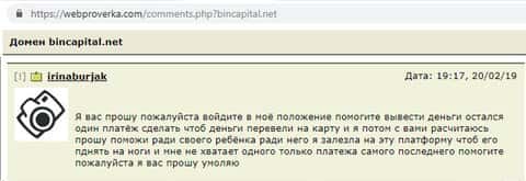 Крик о помощи от обманутой шулерами BinCapital клиентки раздается на портале webproverka com. Женщине срочно нужны были деньги, ей хотелось легко и быстро получить много денег, и она влезла на платформу Бин Капитал. Снять деньги теперь жулики предлагают за отдельную плату.
