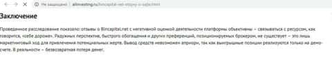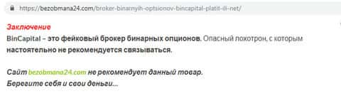 Хорошо изучив бессчетные претензии и негативные отзывы о работе показушников из BinCapital, на сайте безобмана24 ком вынесли правдивое заключение: Бин Капитал – это стопроцентный лохотрон и фейковый брокер, связываться с которым не рекомендуется.