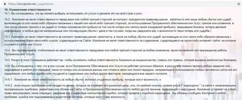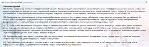 Также учтите, что несмотря на то, что по телефону сотрудники BinCapital будут всячески разводить вас, по-любому обещая быстрые и высокие выигрыши, на самом деле, гарантий никаких они не дают. И это подтверждает соответствующий пункт их прохиндейского соглашения. В частности, нет гарантий на то, что система будет работать или не приведет к потерям. В последнем же случае, компания не несет ответа.