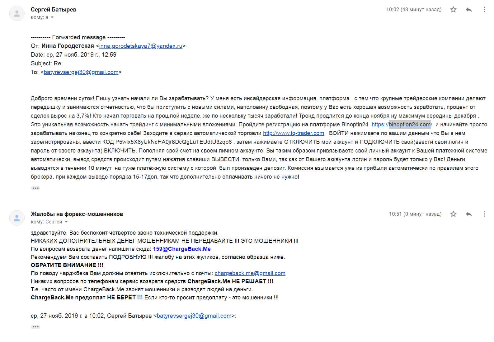 Далее представлена жалоба, в котором скопировано письмо от одного из мошенников BinOption24, которые работают в связке с лохотроном АйКью Трейд. Таким образом аферисты пытаются расположить к своей жертве доверие и тем самым получить от нее больше вложений в свои лоховские проекты.