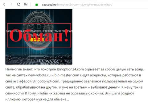 На сайте seoseed ru также подробно было изучен и описан принцип работы конторы. Автор решил сам связаться с этой компанией. Мнение последнего всё то же. БинОпцион24 - просто ВОРЫ!!!Рецензия пользователя Author на сайт мошенничества BinOption24
