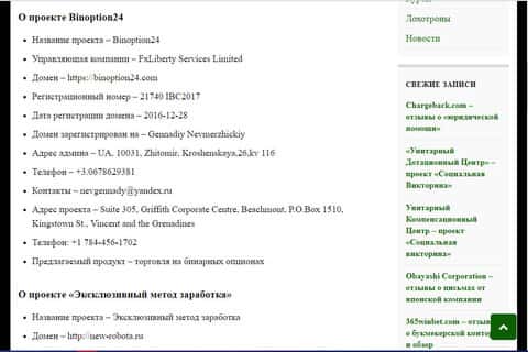 Люди с сайта self-tutorial ru решили "нарыть" информацию на эти фирмы. И самое интересное то, что компания находится на оффшорных островах, а адрес админа на Украине, да и имя, на которое зарегистрирован домен, не иностраное - Геннадий.Обзор сервиса BinOption24 - главная страница