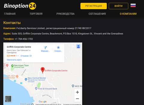 Как и многие интернет-лохотроны, контора BinOption24 отдыхает на оффшорных островах за деньги, наворованные у людей, вблизи Латинской Америки, чтобы в случае чего пропасть без вести и не предстать перед судом за содеянное. Если вас кинули, то вот адрес по которому следует их искать: Suite 305, Griffith Corporate Centre, P.O. Box 1510, Beachmont, Kingstown, St. Vincent and the Grenadines.