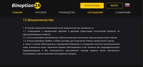 На сайте присутсвует множество документации по урегулированию взаимоотношений компании и клиента. В клиентском соглашении в пункте 5 сказано: Компания не несет финансовой ответственности за результаты Операций, совершенных Клиентом. Что означает полную неприкосновенность шараги от правосудия.Также компания сразу предупреждает о форс-мажорах, которые могут произойти в любой момент, и ответственность за которые она не несёт.В конце соглашения под тему мошенничества существует отдельная статья, в которой говорится о том, что Компания имеет право заблокировать Ваш счет без каких-либо объяснений, во внесудебном процессе.Политика конфиденциальности BinOption24 или откуда у них мои данные