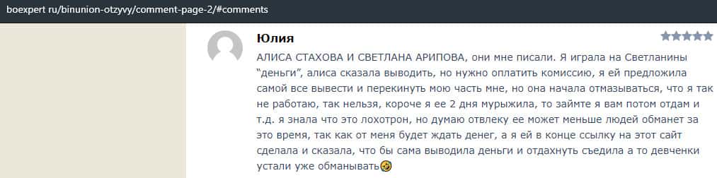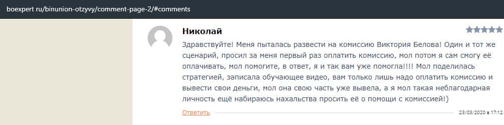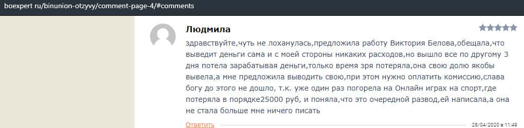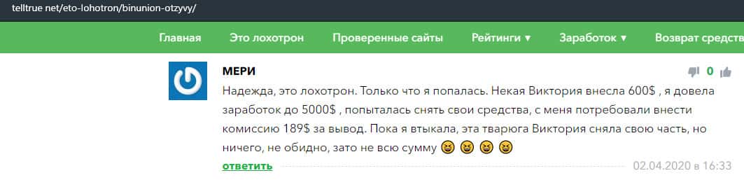 Ниже представлен отзыв от одной женщины, которая попалась на удочку в лохотрон BinUnion Net. Она рассказала в подробностях, как некая Виктория заманила ее в эту кухню и якобы даже помогла заработать деньги. Но после этого стали требовать заплатить комиссию в размере 189 долларов США.