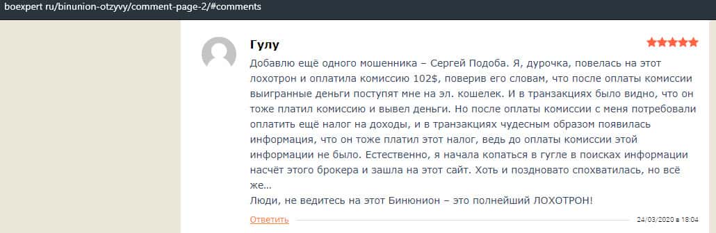 В данную статью можно добавить еще одного мошенника под псевдонимом Сергей Подоба и он как раз работает в бинарном лохотроне BinUnion Net. Женщина повелась на его уговоры и вложила 102 доллара - это была якобы какая-то комиссия за вывод средств. То понятное дело, что ни эту комиссию, ни обещанные деньги никто так и не вернул.