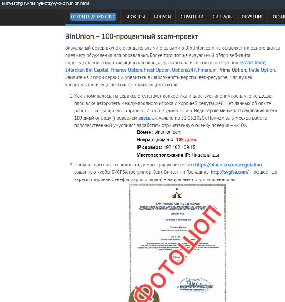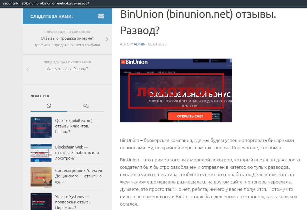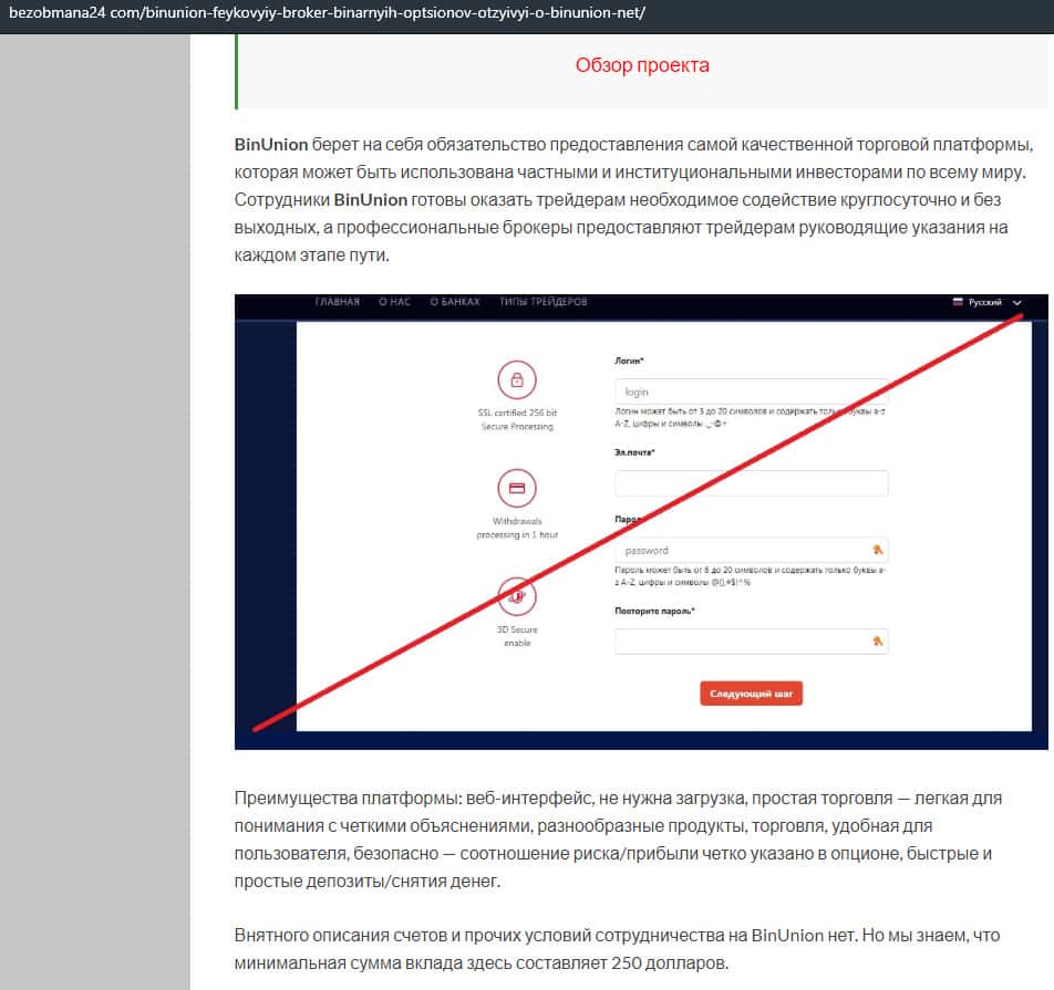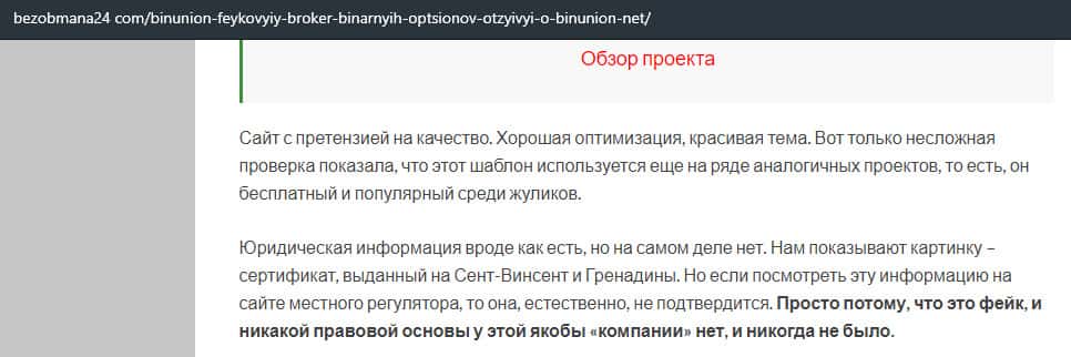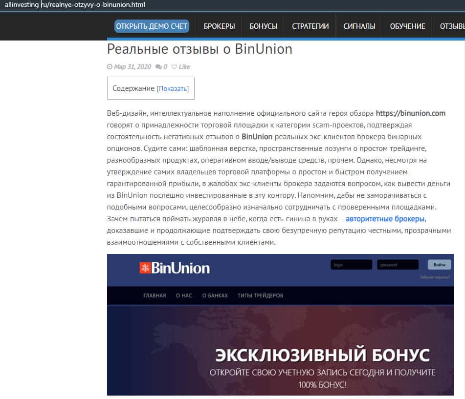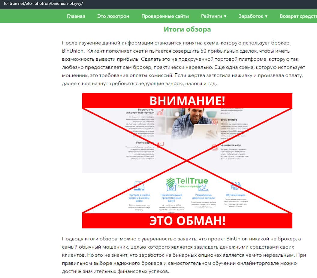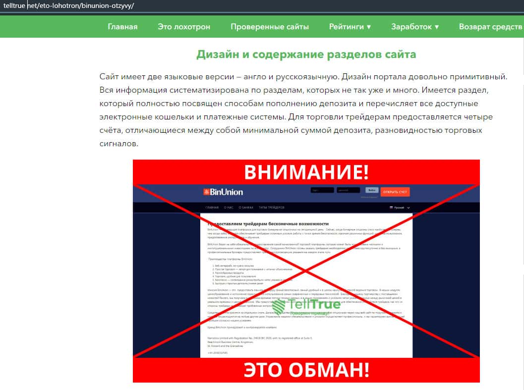 - Обзор сайта мошеннической конторы BinUnion Net