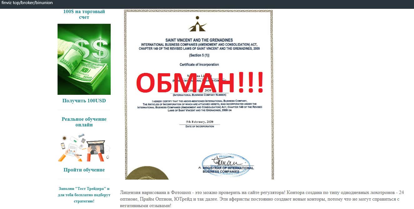 Что касается лицензии и разрешения на деятельность конторы BinUnion Net, то здесь не стоит особо уповать на тот документ, который они предлагают на своем сайте. На самом деле это не лицензия, а просто сертификат о регистрации лохотрона на островах и это по большей части обычный развод.