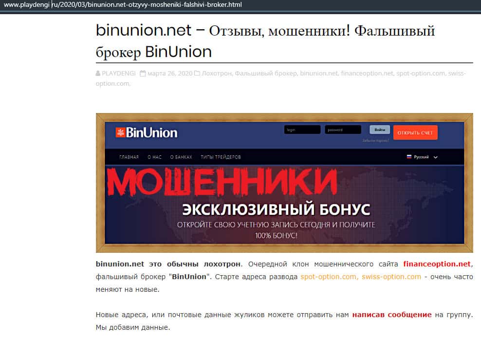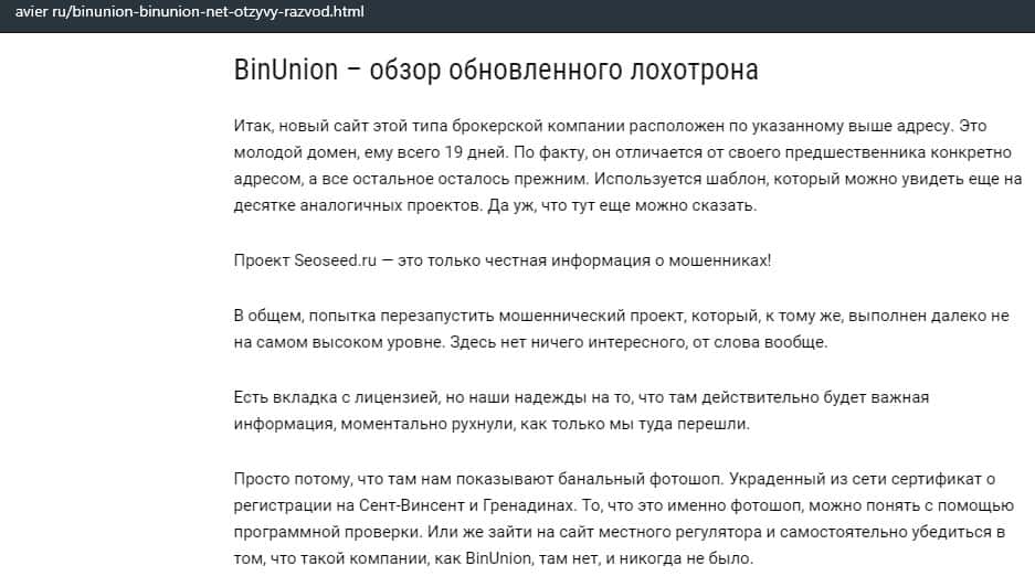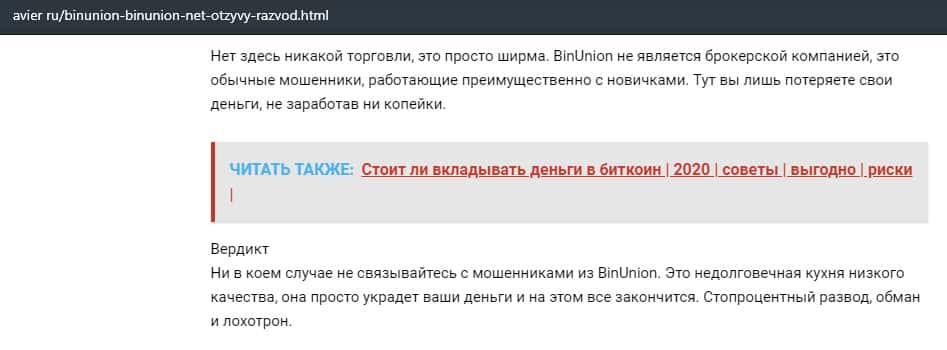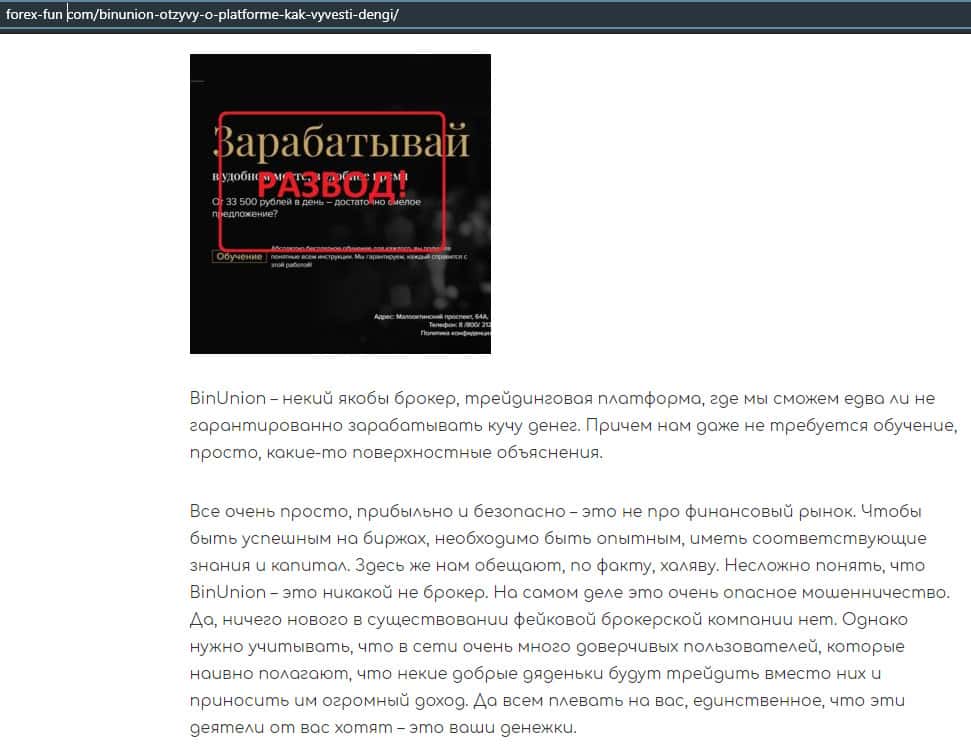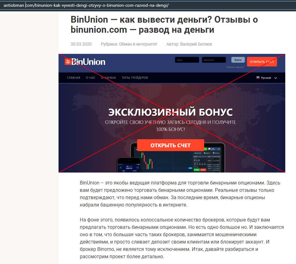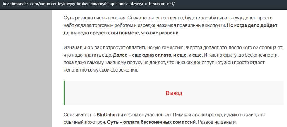 - Статья о мошенничестве в деятельности конторы BinUnion Net