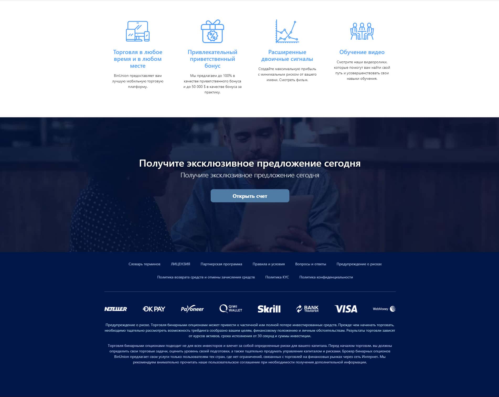 Ниже предоставлена информация с официального сайта конторы BinUnion Net, где описываются данные о предоставлении бонусов всем клиентам, кто согласится открыть и пополнить у них счет. Не нужно вестись на этот развод, потому что они не выведут вам ни копейки.