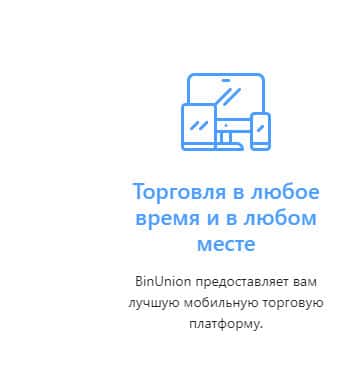 Как гласит сайт конторы BinUnion Net, аферисты предлагают торговать клиентам в любое время и в любом месте, вне зависимости от местонахождения. Даже та мобильная платформа, которая предлагается для торговли ничто иное как фейк и поэтому нет никакого смысла с ними связываться.