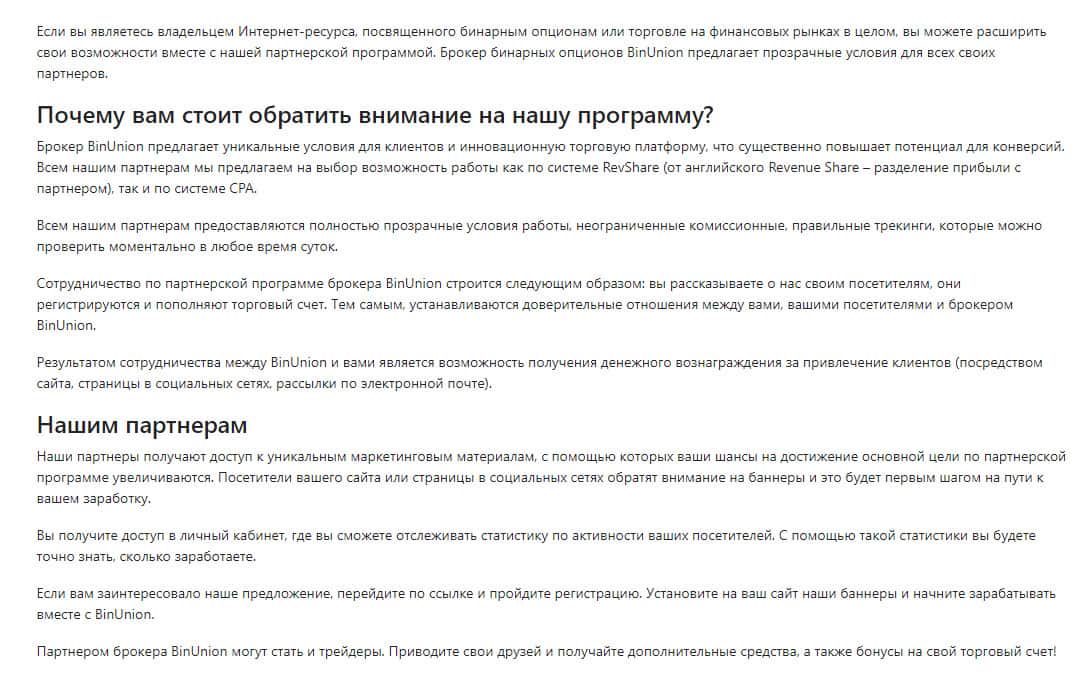 Внятного описания условий торговли, маркетинга, юридической информации в лохотроне BinUnion Net не подразумевается. Потому что вся их деятельность связана с банальным обворовыванием клиентов. Брокер, который переезжает каждый месяц на новый домен не является нормальной компанией.