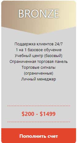 Второй по возрастанию это счет под названием BRONZE, который лохотрон BinUnion Net предлагает открыть клиентам с более широким карманом. Здесь уже нужно вложить от 200 до 1500 долларов и тогда вы даже получите личного менеджера и торговые сигналы. Вот тут то уже вам даже помогут слиться.