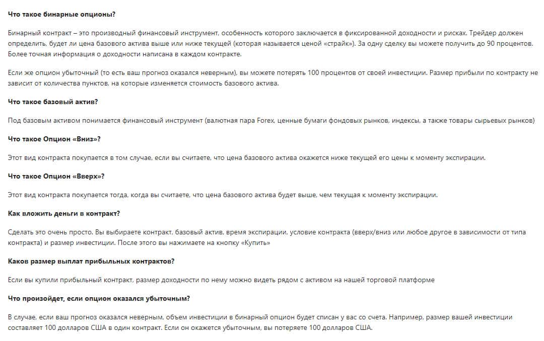 На сайте лохотрона BinUnion Net также можно отметить некоторые моменты, которые касаются ответов на распространенные вопросы на тему бинарных опционов. Зачем выставлять эту информацию на сайте, не понятно. Все эти ответы вы можете найти в интернете в свободном доступе.