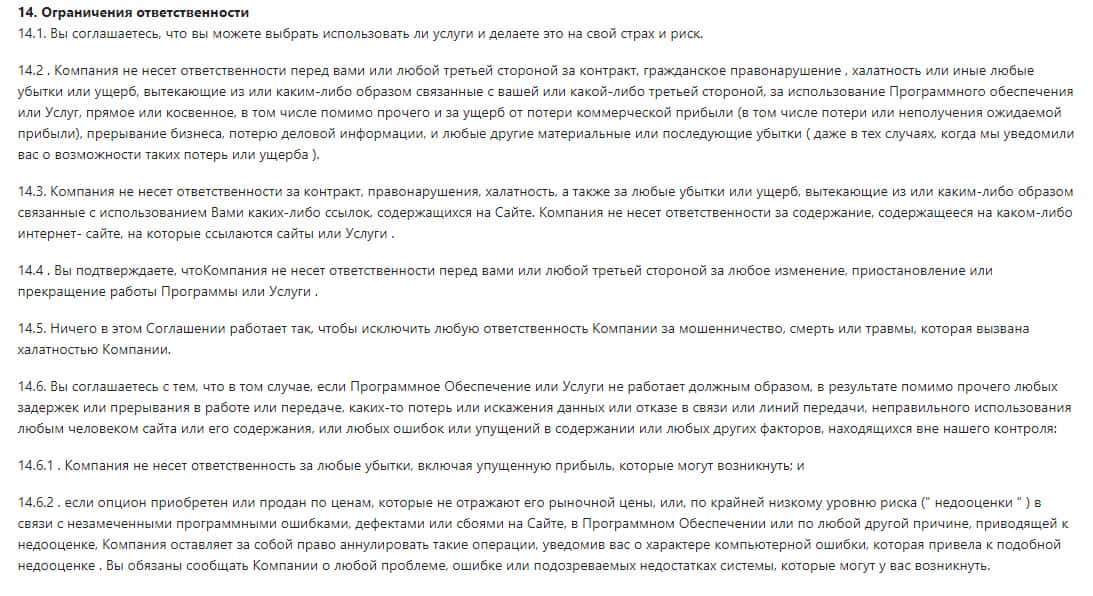 Лохотрон BinUnion Net своим договором снимают с себя полностью ответственность за то, что может произойти с деньгами своих клиентов. Компания не несет ответственность за убытки, включая упущенную прибыль и соответственно пострадавший никак не сможет доказать свою правоту.